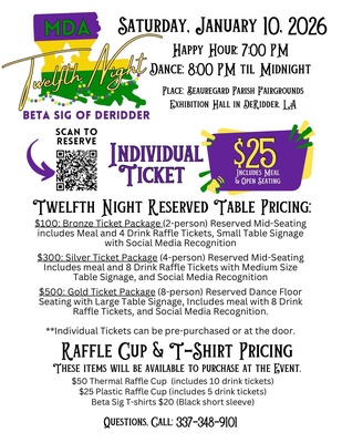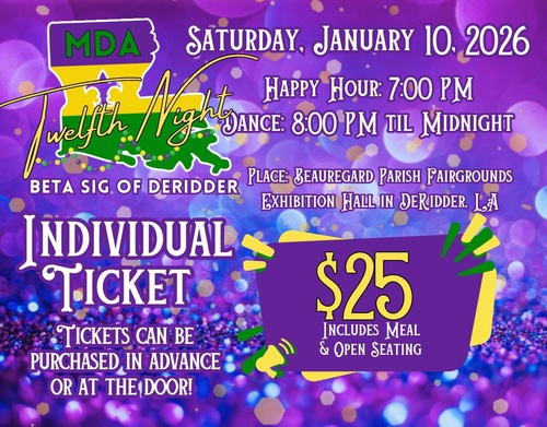 Beta Sigma of DeRidder is proud to invite our community to join us for a special night in support of the Muscular Dystrophy Association (MDA) at our Twelfth Night Celebration.