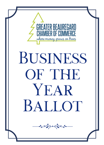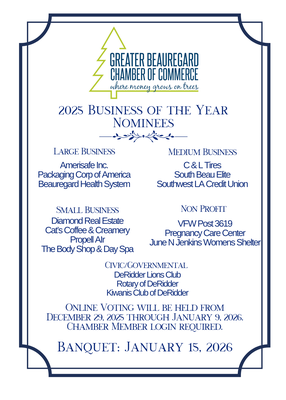 This is your OFFICAL BALLOT for the 2025 Business, Civic & Non-Profit of the Year. Please follow the instruction below to ensure your ballot will be valid. Remember, when you vote your voice is heard. Give careful consideration as to whom you feel has made an impact on Beauregard Parish in 2025. Winners will be announced at the 106th Annual Membership Banquet on Thursday, January 15, 2026.