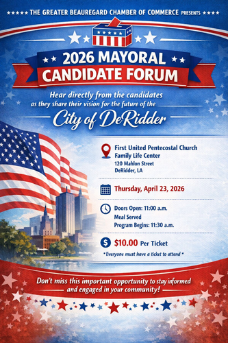 The Greater Beauregard Chamber of Commerce invites our members to attend an important community event designed to keep our business community informed and engaged in the issues that matter most to the City of DeRidder.